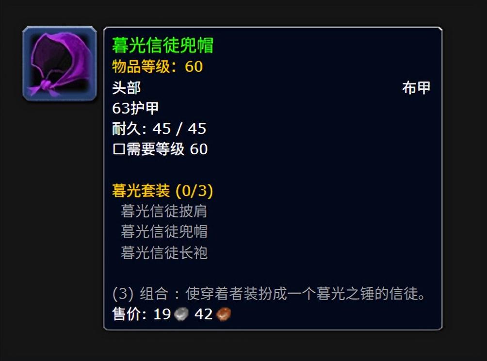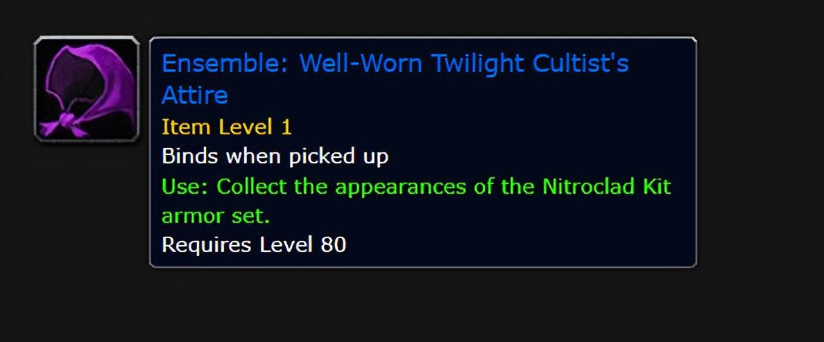 暮光信徒套装最早于经典60的安其拉版本加入,没有任何属性,主要用来开希利苏斯的风石。它最初为绿色品质,不绑定,不能分解,很长时间内并不能用于幻化,直到它被改造成灰色物品,但这时已经绝版。